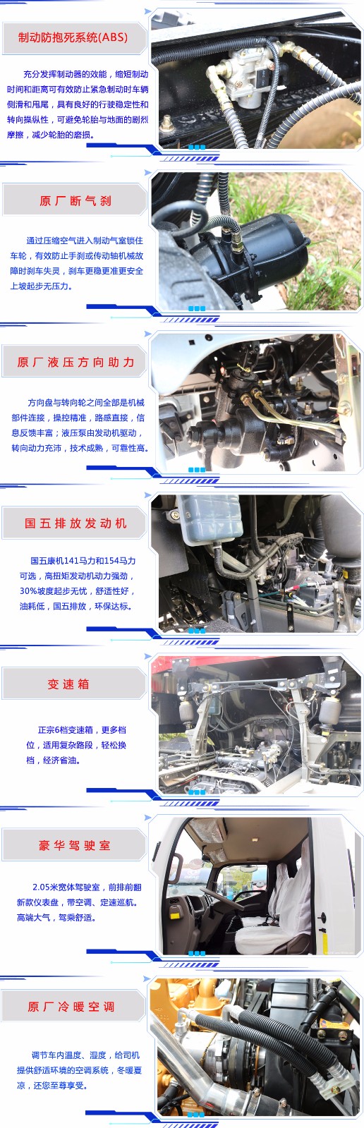 底盤配置:該車才用福田康明斯154馬力發(fā)動機(jī)(歐五排放標(biāo)準(zhǔn)帶尿素罐),6檔手動變速箱,3800mm軸距,7.50R16鋼絲胎,氣剎,帶冷熱空調(diào),帶離合器助力,帶方向助力,帶定速巡航功能,2.05米寬體駕駛室。總質(zhì)量:7噸,車身自重4.8噸。