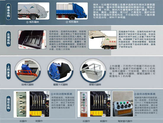 壓縮式垃圾車是專門用于收集城鎮居民生活垃圾和其他可壓縮垃圾的的環衛專用車輛,壓縮式垃圾車由密封式垃圾箱、液壓系統、操作系統組成。整車為全密封型,自行壓縮、自行傾倒、壓縮過程中的污水全部進入污水箱,較為徹底的解決了垃圾運輸過程中的二次污染的問題,關鍵元器件采用進口件,具有壓力大、密封性好、操作方便、安全省力等優點。 主要有后裝壓縮式垃圾車和側裝壓縮式垃圾車,其中后裝壓縮式垃圾車可選配后掛桶收集裝置、鏟斗收集裝置、擺臂收集裝置、掛鐵桶收集裝置,用戶可以根據不同需要選擇不同的收集裝置。