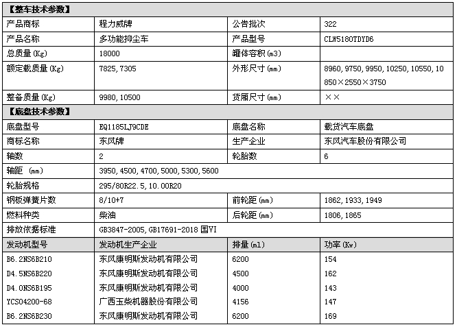 采用東風公司原裝底盤,玉柴200馬力/康明斯210發動機,4500mm軸距,東風6檔變速箱,2315駕駛室,3.9T前橋,8T后橋,295/80R22.5真空胎,250大梁,斷氣剎,空調,電動門窗,中控鎖。
