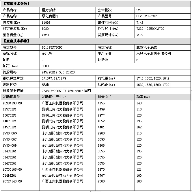 采用東風公司原裝底盤,朝柴170馬力柴油發(fā)動機,國六排放標準,萬里揚6檔變速箱,軸距:3800mm,2.7T前橋,5.5T后橋,245真空胎,雙層大梁,斷氣剎,空調,電動門窗,中控鎖。